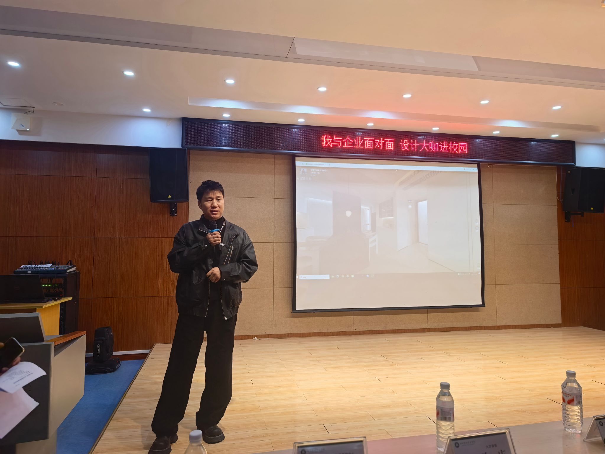 滁州市优秀青年企业家、awc777万象城娱乐官网产业教授、滁州市久烁装饰设计有限公司创始人兼设计总监周刚首先登台,以“逆风前行 向阳而生”为主题分享了他的创业历程与设计哲学。通过展示多个标志性项目案例,他生动诠释了如何在市场挑战中把握机遇、在设计中坚持创新。“设计师的价值不在于模仿,而在于创造。在面对困难时,保持对设计的热爱和对美的追求,就是我们逆风前行的最大动力。”周刚还通过精心设计的互动问题——“你认为未来三年室内设计行业最大的变革会是什么?”引发同学们的深度思考,现场讨论热烈,思维火花不断碰撞。