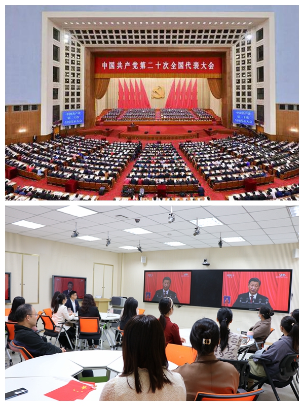 中国共产党第二十次全国代表大会于10月16日上午10时在北京人民大会堂开幕。习近平总书记代表第十九届中央委员会向大会作报告。传媒与设计学院积极部署,线上线下结合学、领导干部带头学、全体党员教师专场学,组织25名党员教师在德馨楼206录播室集中收看党的二十大开幕会。