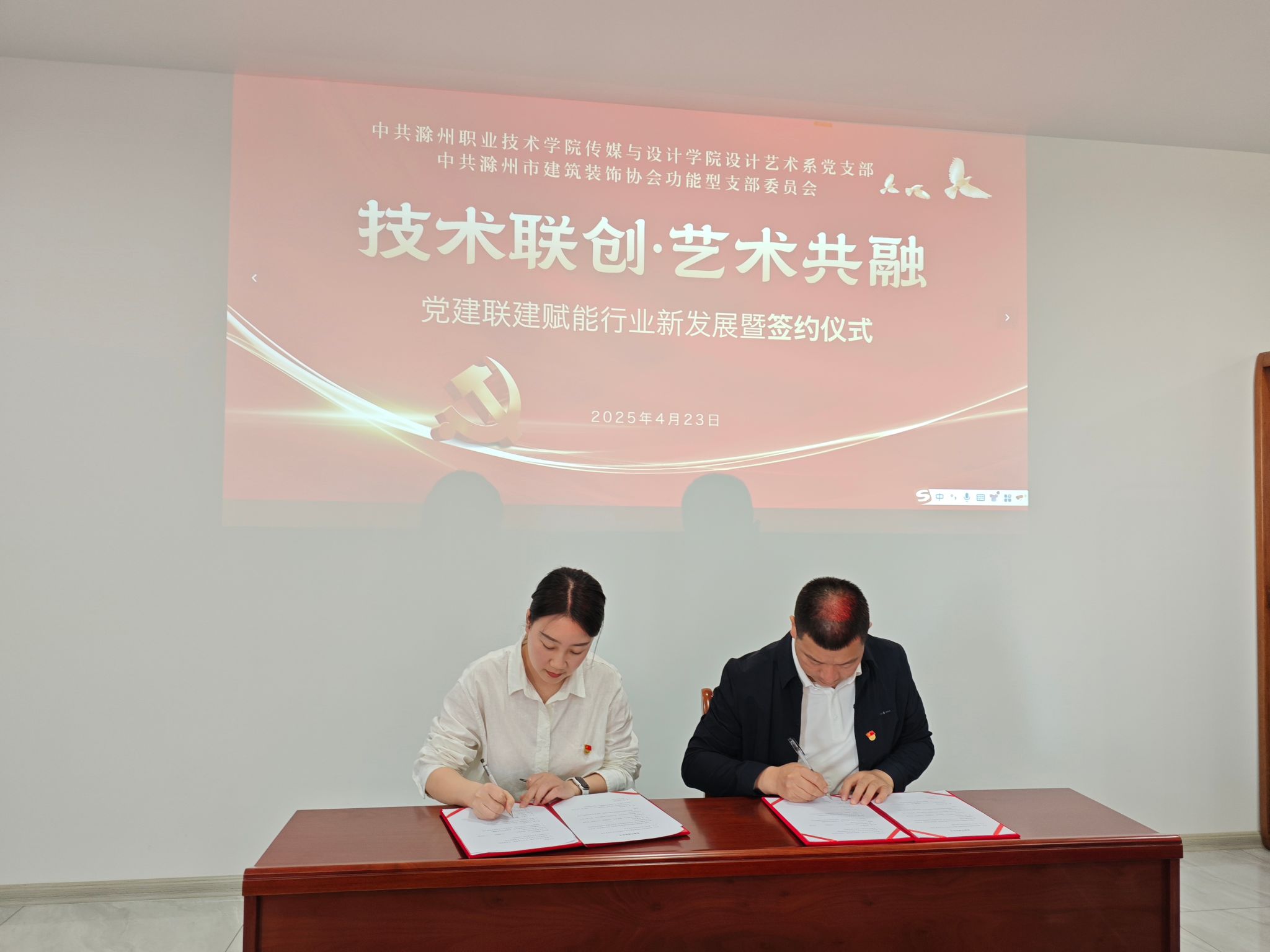 为深入学习贯彻习近平新时代中国特色社会主义思想,贯彻落实新时代党的建设总要求,充分发挥党组织在推动教育发展、服务地方经济中的引领作用,进一步深化校企合作,创新党建工作模式,4月23日下午,设计艺术系党支部一行前往滁州市建筑装饰协会,与滁州市建筑装饰协会党支部正式签署“党建联建”合作协议,并联合开展了“技术联创·艺术共融——党建联建助力行业新发展”主题党日活动,开启了校企党支部携手共进、共同发展的新局面。