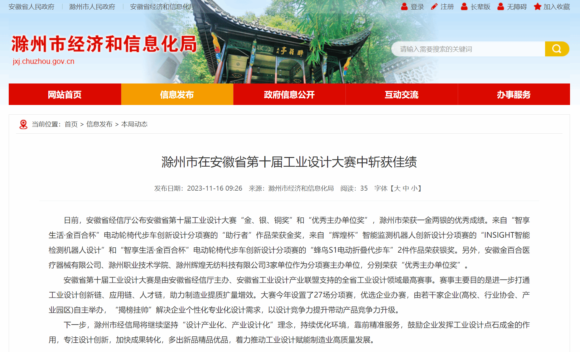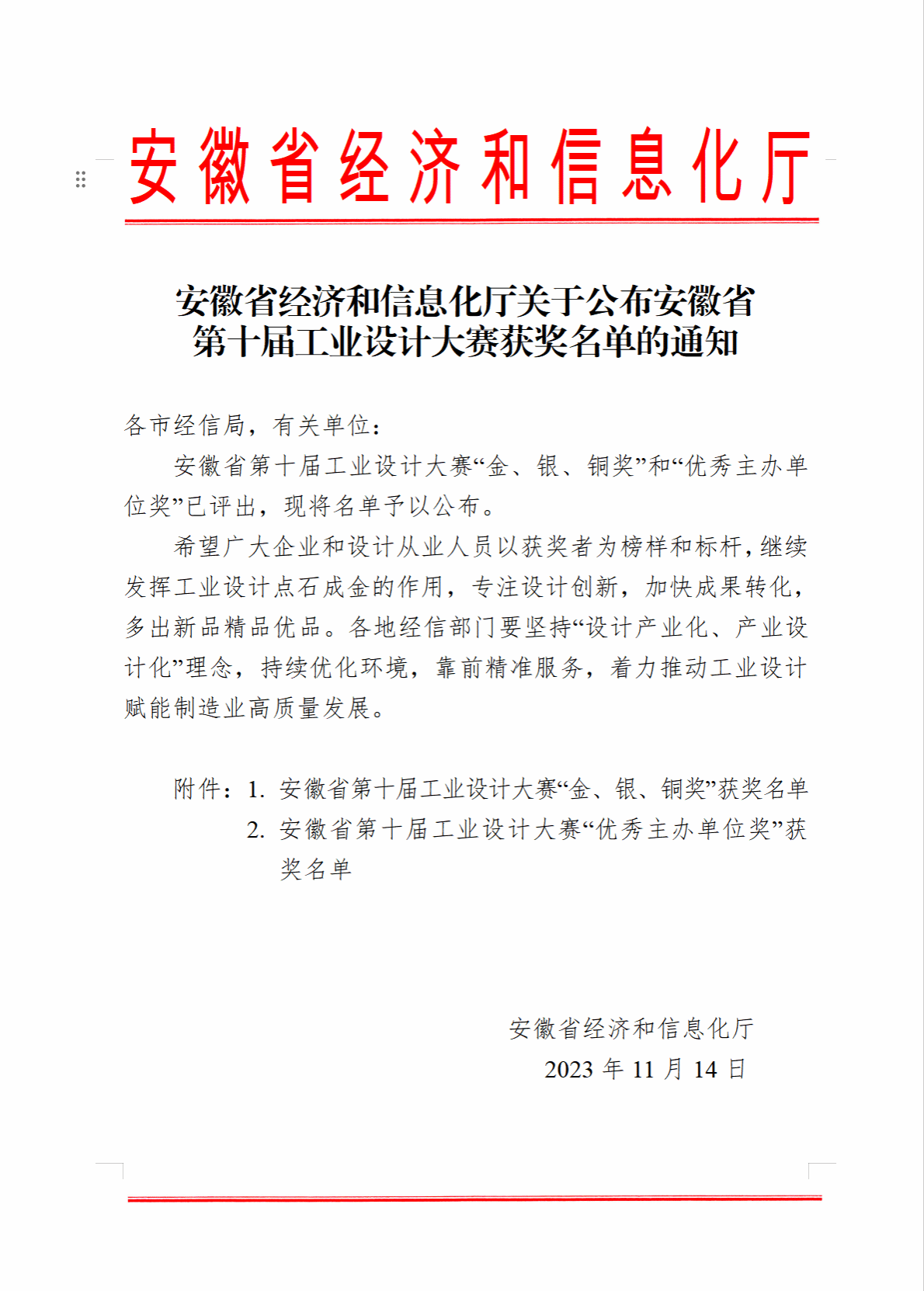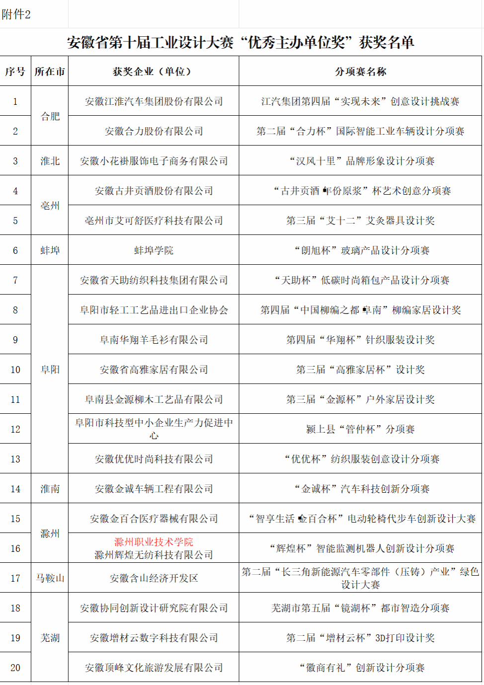 近日,安徽省经信厅公布安徽省第十届工业设计大赛优秀主办单位,awc777万象城娱乐官网和滁州辉煌无纺科技有限公司作为“辉煌杯”智能监测机器人创新设计分项赛主办单位,荣获“优秀主办单位奖”。是省内唯一主办分项赛和获得优秀主办单位奖的高职院校。