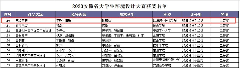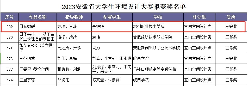 近日,2023年安徽大学生环境设计大赛获奖结果揭晓,传媒与设计学院室内艺术设计专业学子获得二等奖1项、三等奖1项。