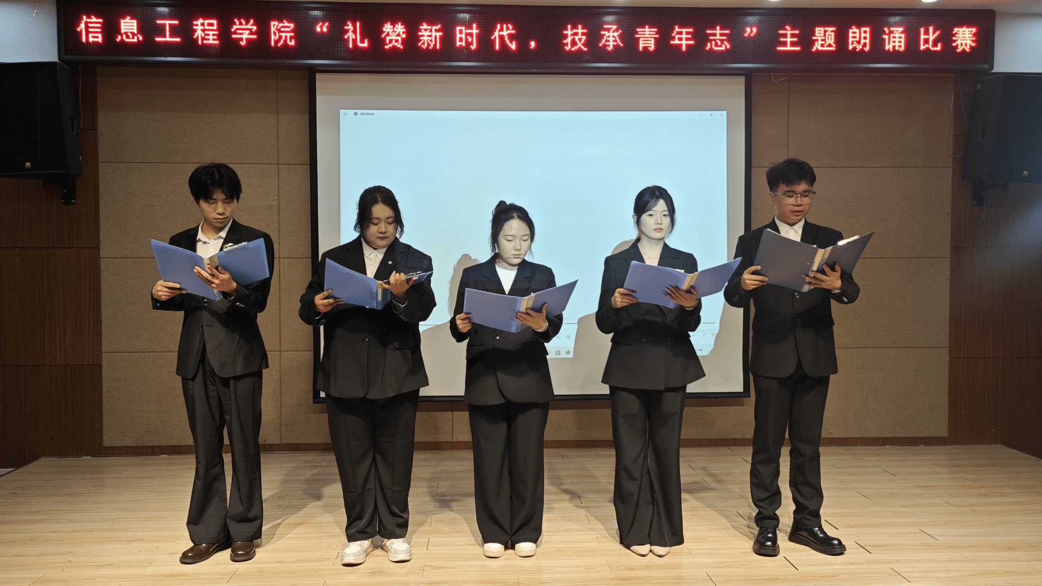 2025年5月21日,由信息工程学院承办的第二十二届校园文化艺术节的“礼赞新时代·技承青年志”主题朗诵比赛在南阶203教室圆满收官。传媒与设计学院代表队以朗诵作品《在祖国大地上报道》惊艳全场,队员朱慧琳、潘佳雨、张翔、李若楠、张华伟凭借极具感染力的情景演绎朗诵,从全校参赛队伍中脱颖而出,斩获团体一等奖。
