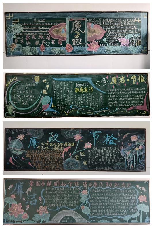 每个参赛的班级,为了出一期高质量的黑板报费尽心思,充分发挥各人所长。参赛的黑板报各式各样,图文并茂,以黑板报的形式加深了大家对“廉洁文化”的了解和认识。评比人员认真,仔细评比着其中的优秀作品,做到公正公平。黑板报的内容和内涵也融入到他们的意识之中,“廉洁文化”的黑板报的评比最终在多数班级优秀作品的获奖中落幕。
