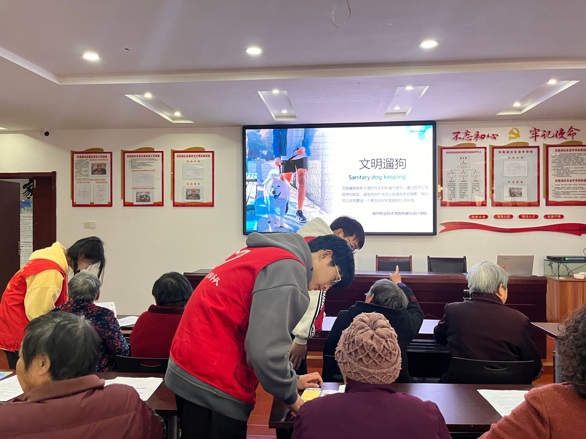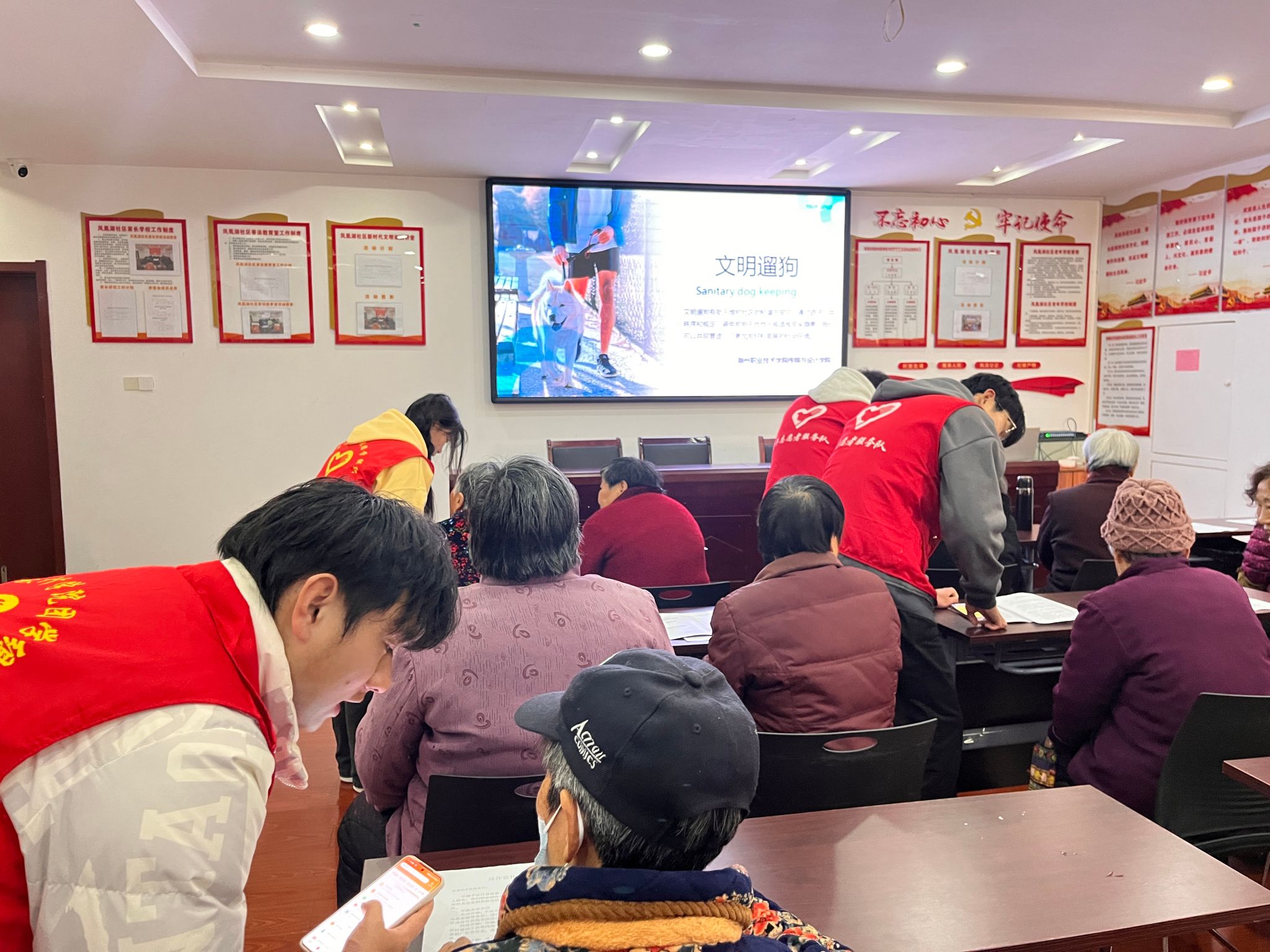 现场,社区居委会与志愿者在社区活动室为居民发放了文明养犬宣传彩页与《文明养犬倡议书》,呼吁家中养犬的居民定期给犬只接种疫苗,防止人畜共患传染病等情况发生,并提醒居民外出遛狗时要拴好狗绳,共同维护社区良好环境。同时,志愿者通过PPT讲解宣传犬只伤人、遛狗不拴绳、犬粪污染环境等问题产生的不利影响。同时提醒居民外出遛狗时要及时清理产生的粪便、杂物等垃圾,保持小区环境整洁。