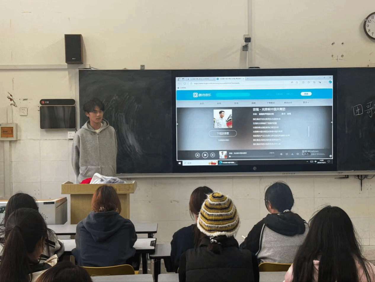 各班级团员齐聚一堂,共唱团歌。团支书对团歌的歌词进行了简要的介绍,对歌唱的一些技巧和重难点做了一些指点。几遍跟唱之后,大家都能很娴熟的演唱。 最后,团员们激情深情地合唱团歌。