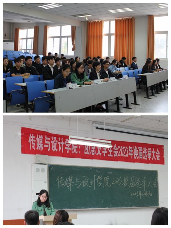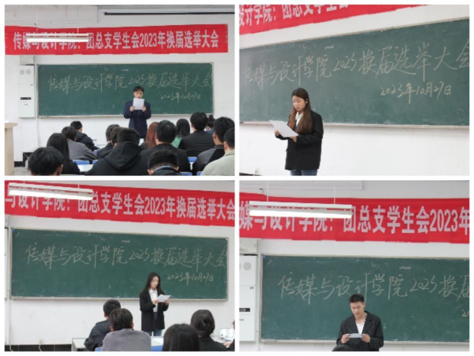 为进一步加强学生干部队伍建设,充分发挥学生骨干在校园文化建设中的重要作用,促进团总支学生会工作的顺利开展,传媒与设计学院于2023年10月27日下午3点,在北阶102教室召开了2023年团总支学生会换届选举大会,学院团总支书记瞿康宁、党总支秘书刘娟、辅导员代表郭伟、教师代表赵璇出席会议,团总支学生会新老学生成员参加会议。