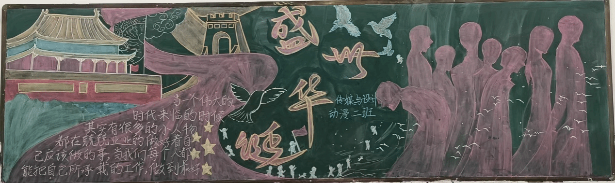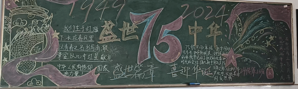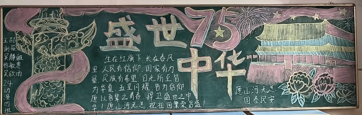 为庆祝中华人民共和国成立75周年,传承血脉中的红色基因,营造浓烈爱国氛围。传媒设计学院团总支组织各班级团支部围绕“用吾辈之力,捍卫盛世中华,祝福伟大祖国繁荣昌盛”主题举办黑板报绘制活动。