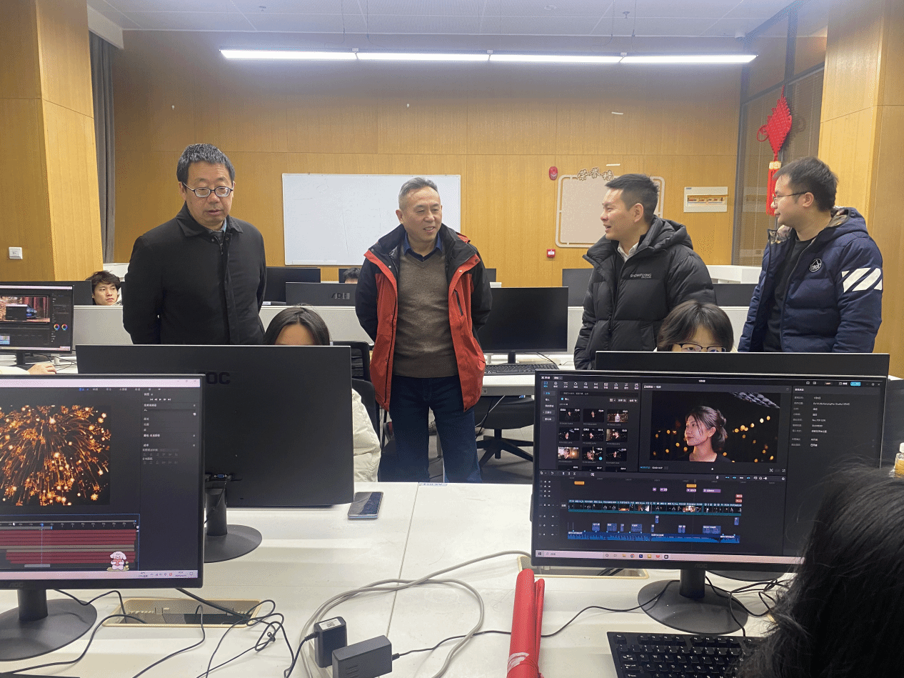 在企业实践中心负责人余民的陪同下,李平权一行参观了短视频制作组实训室、直播运营组直播间等实训场所,并深入学生公寓,与学生亲切交流,了解学生在实践中心的学习、工作、生活情况。