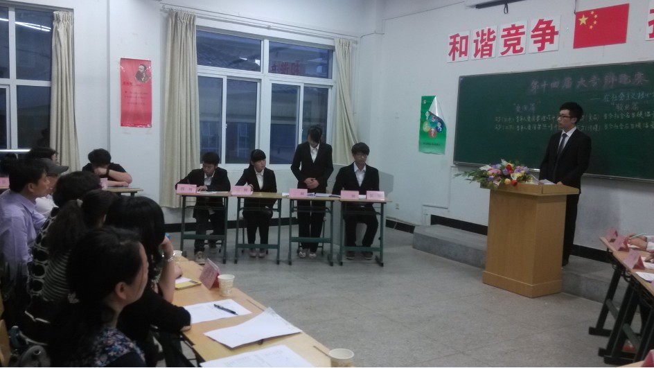 开始,我方辩友就以各自新颖、诙谐的言语作出精彩的自我介绍,从而赢来了整个赛场的第一波高潮。在接下来的三个对战环节中,双方都备战充实,你来我往,互不相让,各自围绕着自己的观点进行阐述。自由辩论的阶段中,比赛气氛更是异常的激烈,双方唇枪舌战,尽显风采,侃侃而谈而又不失风度。