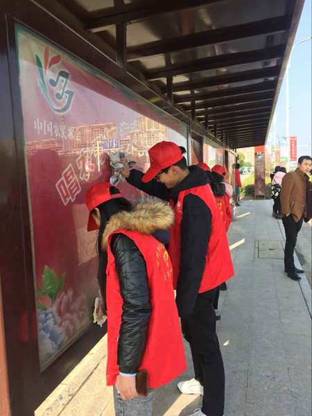近日,传媒工程系团总支在副书记朱胜的带领下分别对学校附近的几个公交站台进行了清理,志愿者们穿着统一,自带抹布,清洁球,水桶等工具,大家分工明确。大家不怕脏,不怕累,用各种方法清除那些随意张贴的广告,在众人的努力下,原本模糊不清的站台恢复了本来面目。辛苦换来了清洁,大家都很高兴。许多等车的市民频频为志愿者们“点赞”,一个老大爷激动地说:“这下好了,站牌终于能看清了,要是人人都能像你们这样,懂得爱惜公共设施,就不会有乱贴乱涂的现象了”