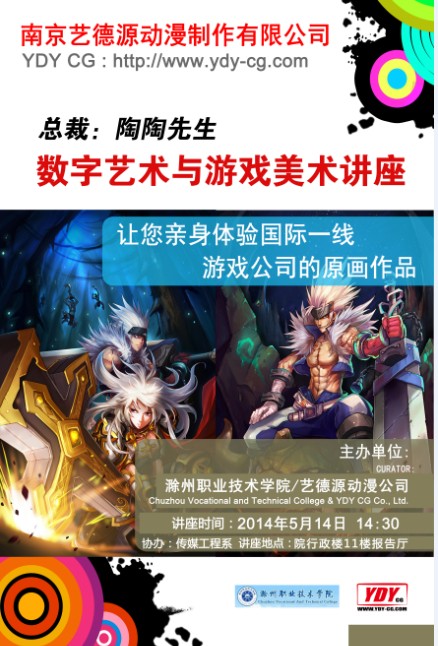 数字游戏绘画技术是现代动画技术最重要的组成部分,传媒工程系将于5月14日隆重邀请到江苏省著名动画师南京艺德源总裁陶陶先生来我院进行数字艺术与游戏美术讲座。届时全院师生都可去现场莅临现场观摩。此次讲座不仅涉及到传媒工程系的专业建设未来发展方向,同时也给全院师生带来全新的数字动画视觉感受。
