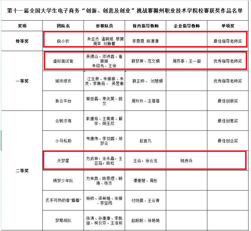 本次校内选拔赛吸引了来自全校各个学院的52支队伍报名,经过专家的严格评选,我院参赛团队收获颇丰:“皖小农”项目(参赛队员:朱亚杰、温晓旭、蔡赟、周苹、刘静馨,校内指导教师:李雯雯、陈潇潇)荣获特等奖;“虚拟面试官”项目(参赛队员:吴德山、邓诗鑫、崔居振、朱镕先、王徐,校内指导教师:薛梦琪、范文娟,企业指导教师:周苏亭、王一超)荣获一等奖;“天梦星”项目(参赛队员:方武林、余永晶、王亚茹、陈松,校内指导教师:王会、徐云龙,企业指导教师:陆良兵)荣获二等奖;我院教师李雯雯、陈潇潇获“最佳指导老师奖”;薛梦琪、范文娟、周苏亭、王一超获“优秀指导老师奖”。