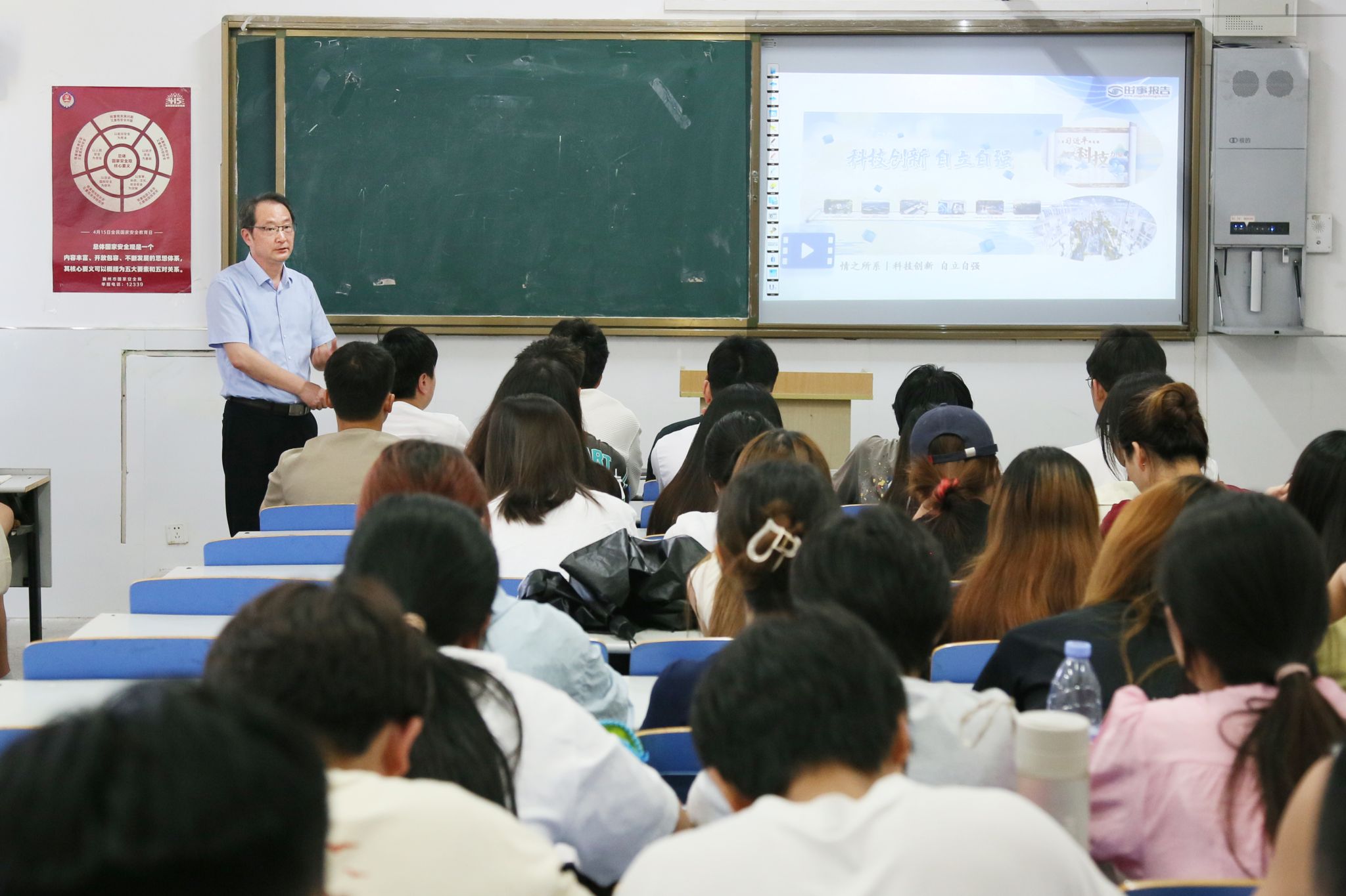 6月12日下午,校党委副书记、校长许雪峰深入二级学院教室,为2022级环境工程、2022级食品生产等班级学生讲授形势与政策课,食品与环境工程学院80余名师生现场听课。