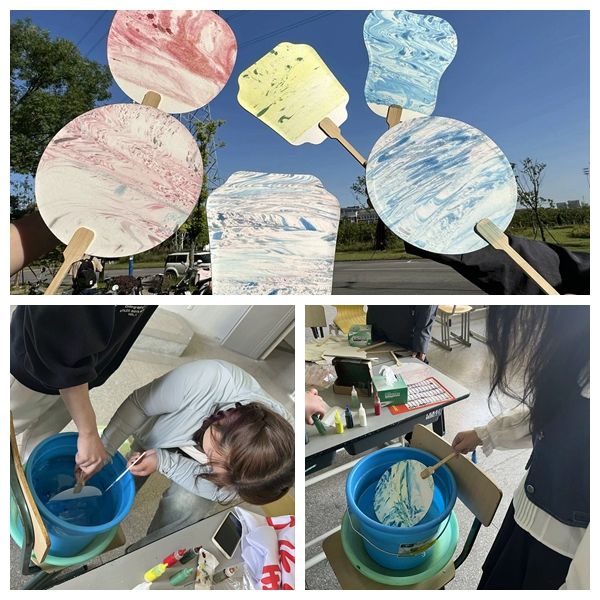 学生们分组进行了漆扇制作实践。他们亲自挑选扇型,滴漆入水,以漆为笔在水中作画,最后出水成扇。每一个步骤都精心操作,力求完美。在制作过程中,学生们不仅学会了如何运用细腻的笔触勾勒图案,还体会到了漆艺的耐心与精细。有的学生选择了山水花鸟,有的则尝试了现代抽象设计,每把漆扇都蕴含着他们的创意与情感。