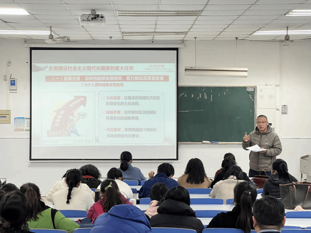 11月15日下午,校党委委员、商学院党总支书记李超在1119教室讲授题为《全面建设社会主义现代化国家的重大任务》主题党课。商学院、管理学院及图书馆全体党员教师参加。