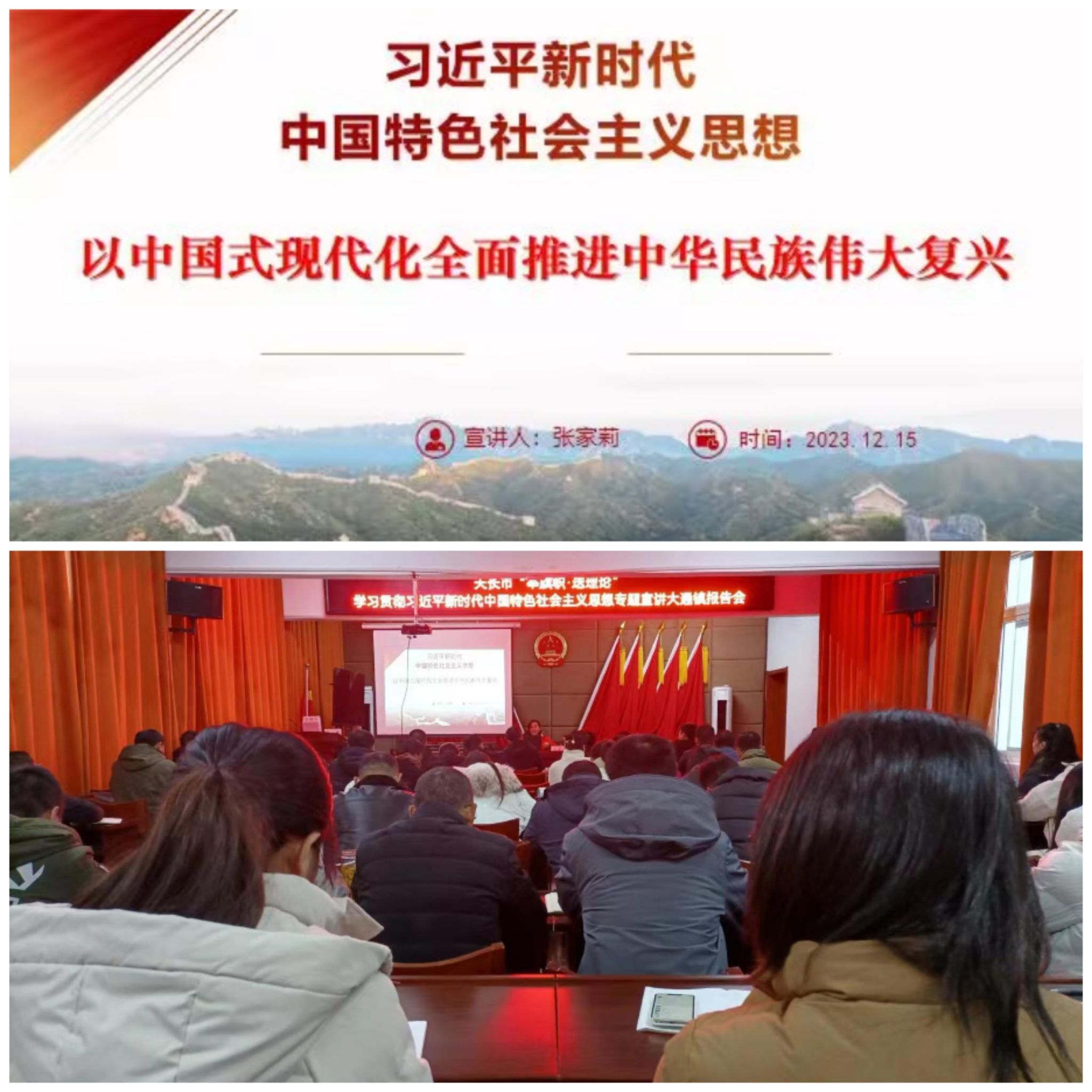 为深入开展学习贯彻习近平新时代中国特色社会主义思想主题教育,天长市大通镇人民政府邀请awc官网马院教师为镇政府开展“举旗帜·送理论”学习贯彻习近平新时代中国特色社会主义思想专题宣讲。马克思主义学院于12月15日派出张家莉副院长为大通镇做“以中国式现代化全面推进中华民族伟大复兴”专题报告。