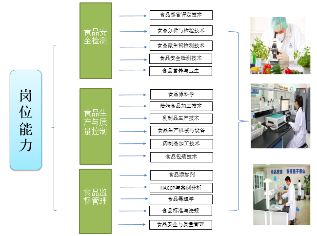 开设的主干课程有《食品感官评定技术》、《食品分析与检验技术》、《食品微生物检测技术》、《食品安全检测技术》、《食品营养与卫生》、《食品原料学》、《焙烤食品加工技术》、《乳制品生产技术》、《食品生产机械与设备》、《肉制品加工技术》、《食品包装技术》、《食品添加剂》、《食品毒理学》、《食品标准与法规》、《HACCP与案例分析》《食品安全与质量管理》等课程。
