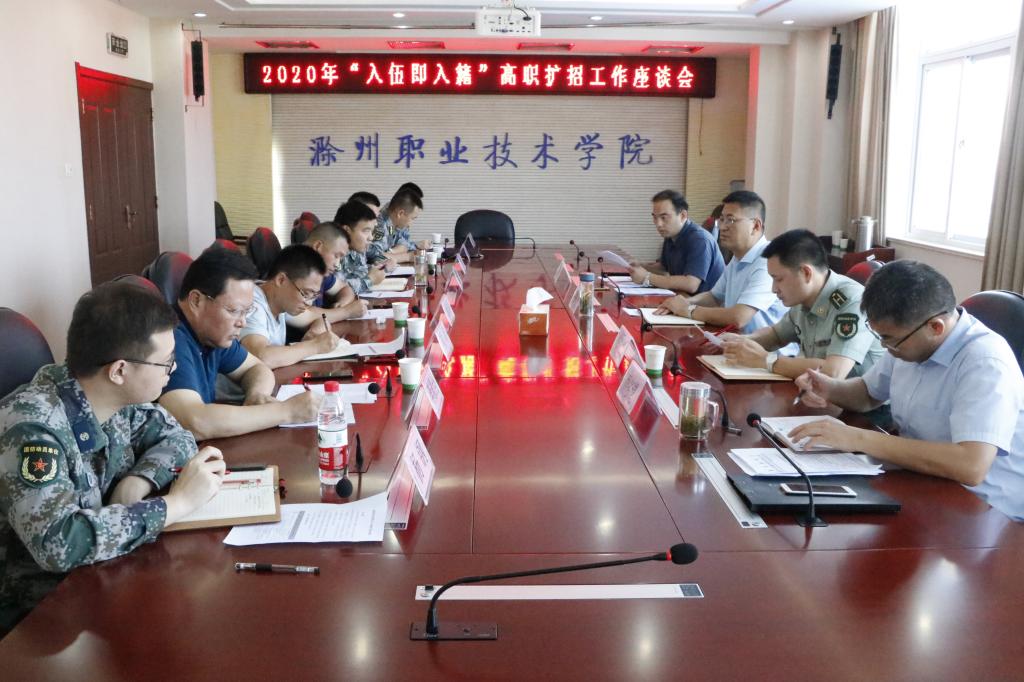 8月24日上午,学校在综合楼904会议室召开2020年“入伍即入籍”高职扩招工作座谈会。学校党委委员、校长助理、招生就业处处长穆松,滁州军分区参谋梁伟校以及各个县市区人武部负责人参加了座谈会。会议由学校创新创业学院常务副院长、招生就业处副处长周多道主持。