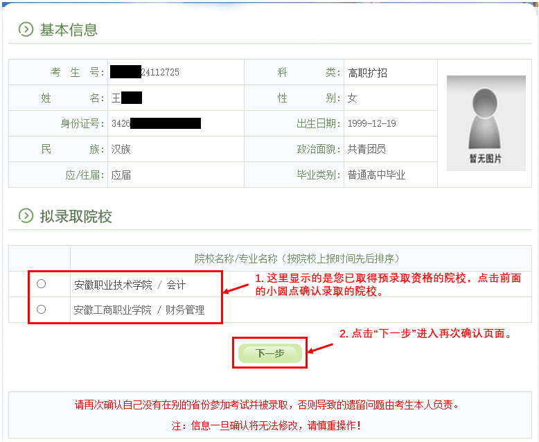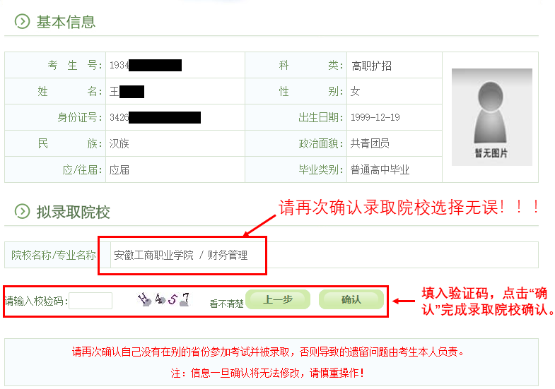 ➢ 一旦确认了录取院校,是不能再次修改的,请谨慎操作!!!