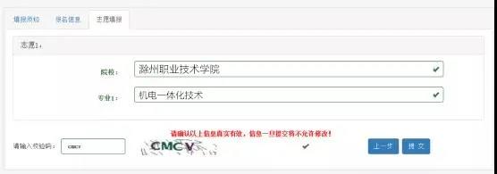 报名信息填写完毕后,请再次核对本人所填信息是否有误,若有更改,请点击“上一步”,进入填报页面进行修改。确认无误后,填写页面下方的验证码,并点击“提交”按钮提交信息。信息一旦提交,任何人不得修改!
