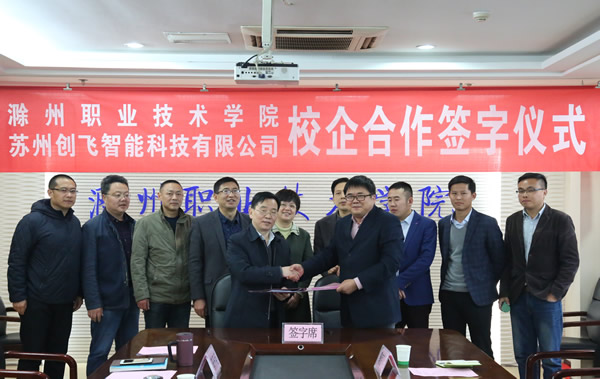 4月10日下午学院和苏州创飞智能科技有限公司签署了校企业合作协议。苏州创飞智能科技有限公司董事长官建军、公司运营总监鞠京梁、技术总工程师吴开吉,党委副书记、院长李柱梁,党委委员、副院长江洁,党委委员、院长助理、招生就业处处长穆松、信息工程系、教务处、招生就业处主要负责人参加了仪式。