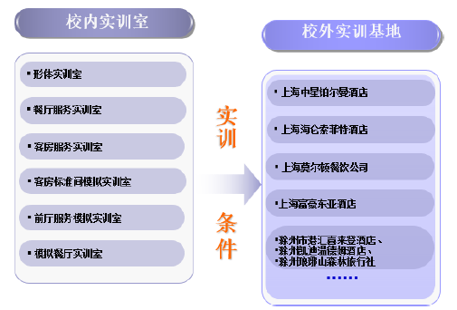 旅游管理专业目前为“省级特色专业”,并建有“省级示范实训中心”。目前校内有餐厅模拟实训室、客房模拟实训室、前厅模拟实训室、形体训练教室等实训场所,为学生的校内教学提供仿真实践教学环境;同时与滁州及上海、南京等地的多家星级酒店、餐厅、旅行社、旅游景区等企事业单位密切合作,建立校外实训基地,为学生就业提供坚实的培训条件和保障。