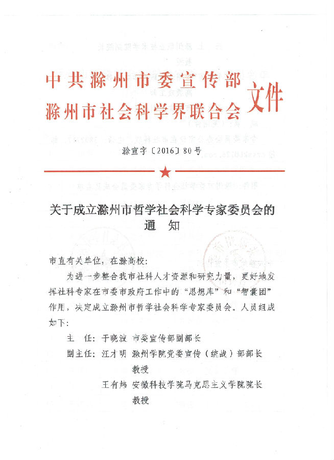 近日,接滁州市委宣传部《关于成立滁州市哲学社会科学专家委员会成员的通知》(滁宣字﹝2016﹞80号)文件,我院汪上、吴大明、李爱红、童宗安、陈光锐等5位同志进入滁州市哲学社会科学专家委员会成员,其中,汪上为委员会副主任委员,这是我院发挥人文社科人才资源力量更好地为地方经济社会服务的一个有力平台。