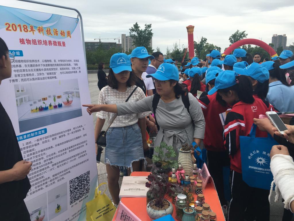 该科研团队在姜自红、贾雪晴老师两位老师的精心准备下,确立了科技活动周科技成果展示的主题——植物组培微瓶景。微瓶景又称 “玻璃花园”,是利用植物组织培养技术,以植物根、茎、叶等组织材料,采用适宜的培养基,在无菌条件下快速繁殖的克隆苗制成的瓶景。在启动仪式上,我院科技产品刚展出就引起了大家的强烈关注,展位被围的水泄不通,很多市民好奇的提问 “这里面的植物是真的吗”,“植物怎么种进去的呀”,“瓶子底部透明部分是什么”……还有一些人当场要购买。面对观众的热情询问,两位老师耐心讲解,向市民们做了一场植物组织培养原理的技术的科普教育。