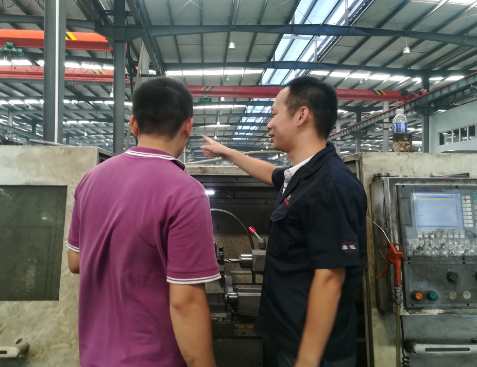 图为汽车系疏剑老师与一线机加工人员进行沟通交流