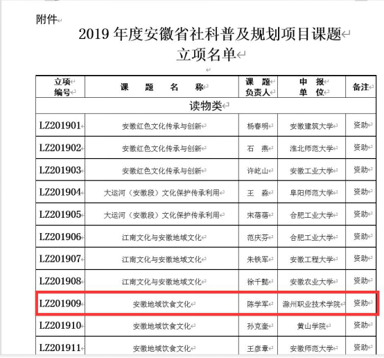 近日,根据安徽省社会科学界联合会下达的“2019年安徽省社科普及规划项目立项的通知”获悉,经公开申报、资格审查、专家评审、公示等环节,2019年安徽省社科普及规划项目共立项49项,其中读物类项目37项,工作研究(规划研究)类项目12项,awc官网陈学军教授主持的《安徽地域饮食文化》(LZ201909)项目立项建设,获资助经费1.5万元。