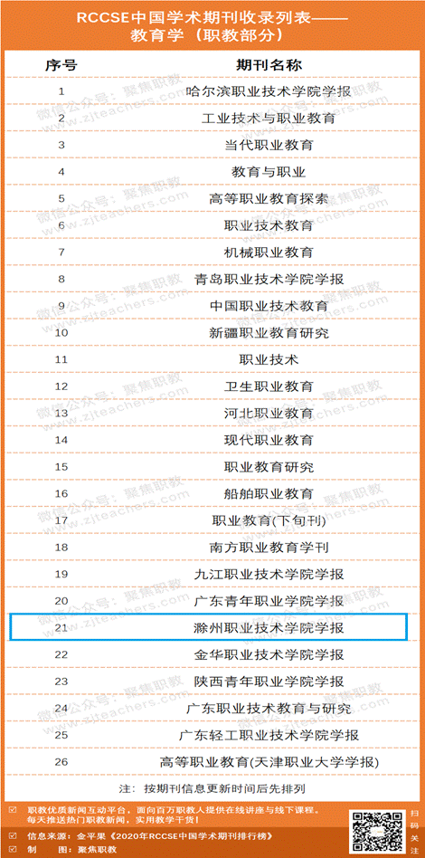 学术期刊是学术成果评价、发表、展示和传播的主要载体,是服务于国家科技创新体系和文化创新体系的重要平台。近日, “2020年RCCSE中国学术期刊收录列表—教育学”发布(注:RCCSE是武汉大学中国科学评价研究中心Research Center for Chinese Science Evaluation缩写),全国教育学期刊总数有294个,关于职业教育的有26个(名单见下图),其中有9本期刊是职业学院学报,《awc777万象城娱乐官网学报》名列其中,说明awc官网学报坚持服务职业教育教科研工作的办刊宗旨,注重办刊质量,在学术期刊领域占有一席之地。