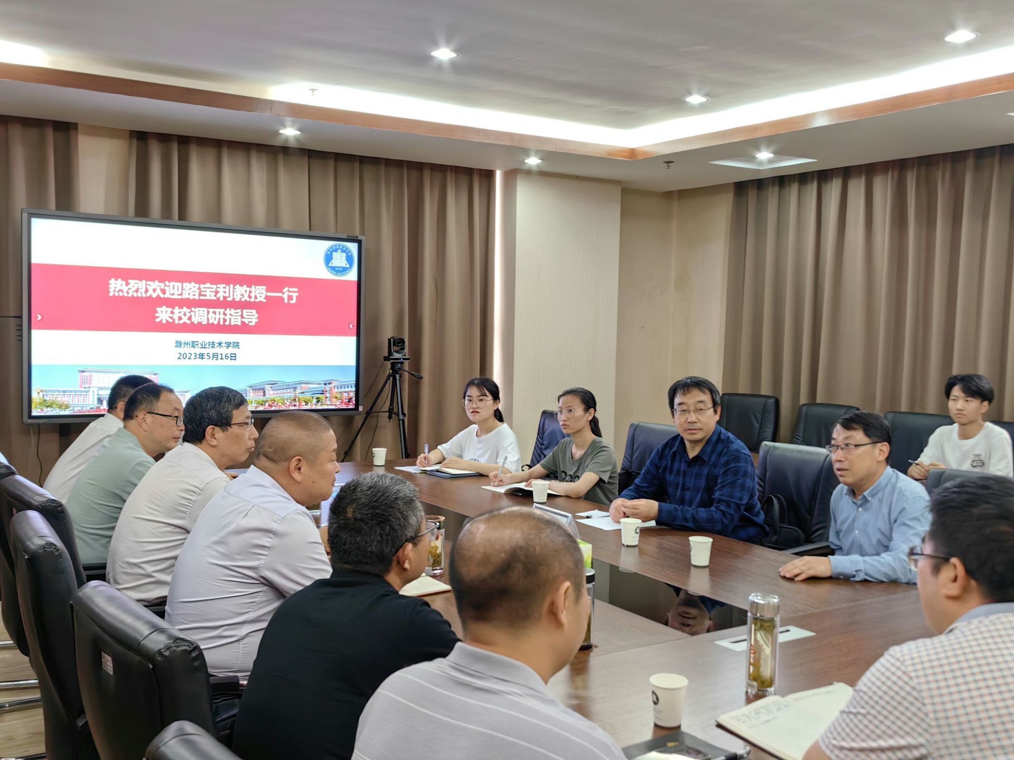 5月16日下午,安徽师范大学教育科学学院博士生导师路宝利教授率课题组成员来awc官网调研职业教育工作。滁州市教体局职业与成人教育科蒋新华科长陪同调研,安徽滁州职教集团秘书处、科技处(职教研究所)相关工作人员、部分教学院部负责人和教师代表参加调研座谈会。科技处处长(所长)肖陆飞主持座谈。