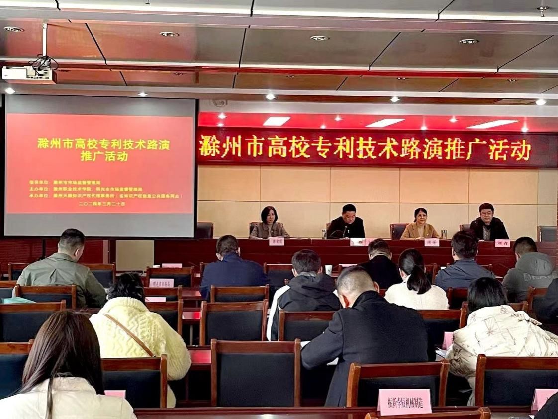 本次活动是滁州市高校专利技术路演第一场推广活动。滁州市市场监管局二级调研员梁芳出席活动并讲话,安徽科技学院、滁州学院、各县市区市场监督管理局、明光市相关科技型企业、知识产权代理服务机构、技术经纪人等人员参加了活动。学校科技处组织并参加了活动。
