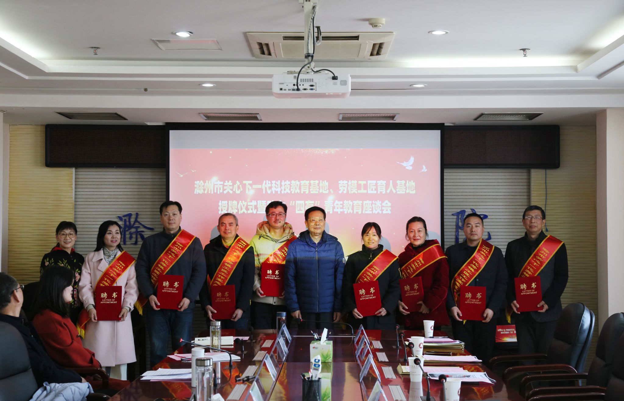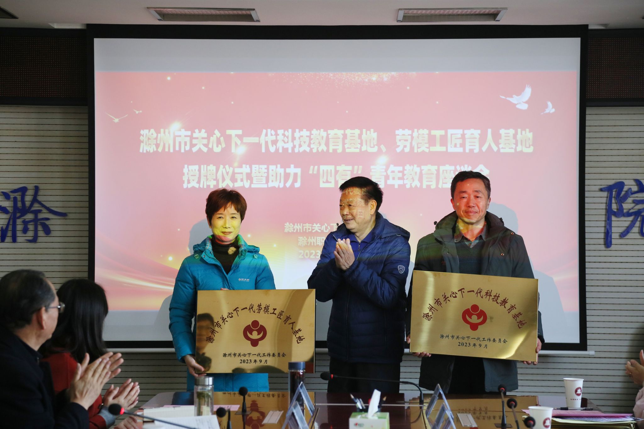 为深入学习贯彻党的二十大精神,贯彻落实习近平总书记关于职业教育的重要论述,弘扬劳模、工匠精神,发挥职业院校科技育人功能,12月27日上午,滁州市关工委来校召开滁州市关心下一代科技教育基地、劳模工匠育人基地授牌仪式暨助力“四有”青年教育座谈会。市关工委常务副主任傅厚华,市关工委副主任朱荣,市关工委办公室副主任张华忠,校党委副书记杨家庆,校党委委员、组织人事处处长王宇等出席会议。会议由朱荣主持。