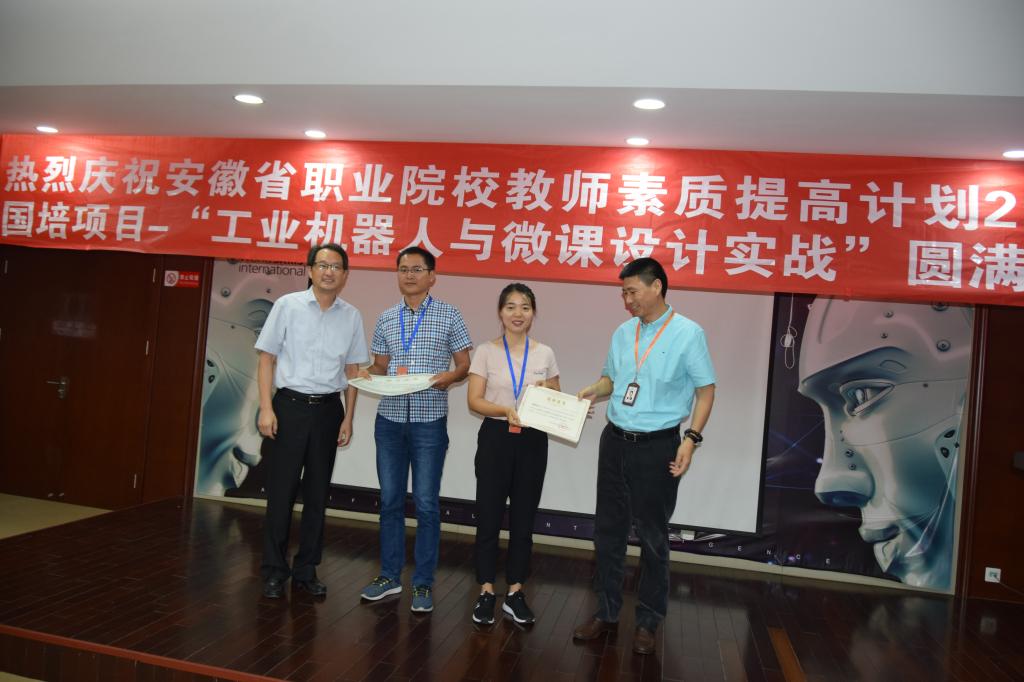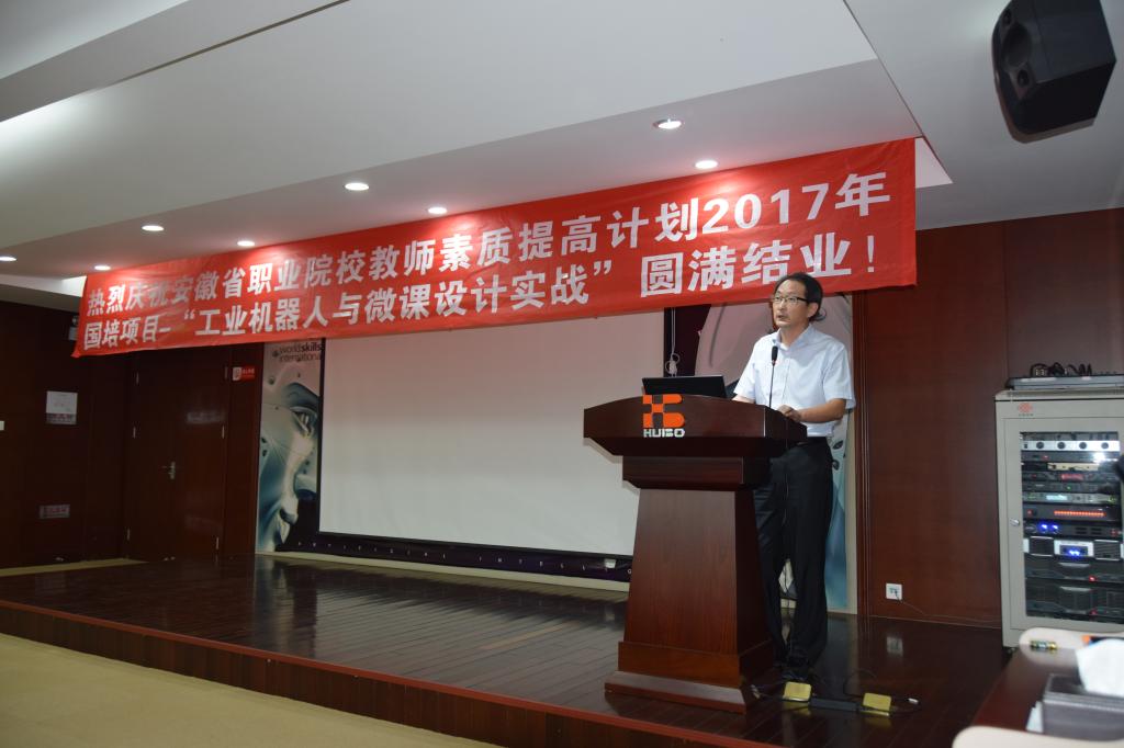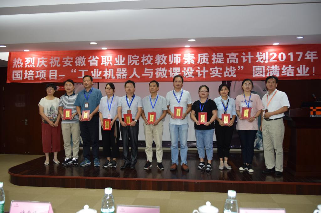 2018年8月9日上午,安徽省职业院校教师素质提高计划2017年国培项目-“工业机器人与微课设计实战”结业典礼在江苏汇博机器人技术股份有限公司如期举行,awc777万象城娱乐官网党委副书记、院长许雪峰、副院长江洁、组织人事处相关同志等一行前往苏州参加结业仪式。出席结业仪式的还有汇博公司董事长孔繁河、总裁助理马明军等。