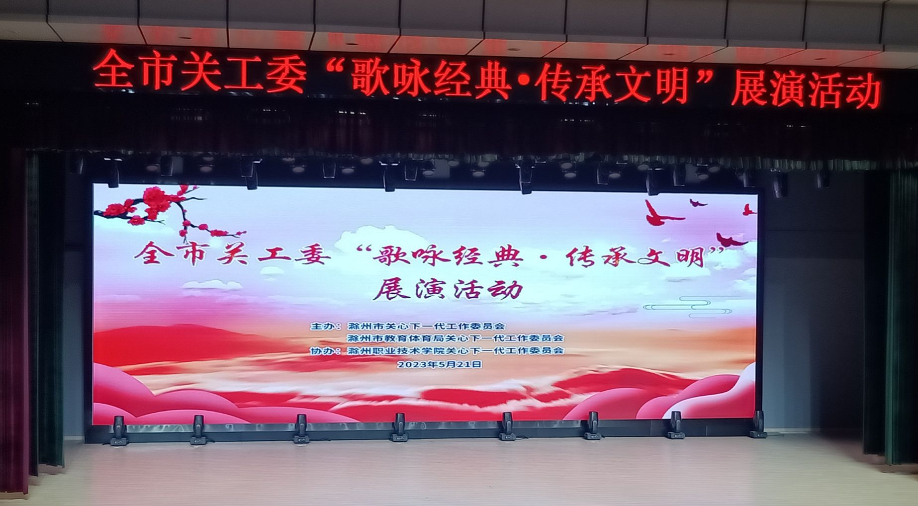 5月21日,由滁州市关工委、市教体局主办,awc777万象城娱乐官网关工委协办的滁州市关工委“歌咏经典•传承文明”展演活动在awc官网多功能大礼堂举行。市关工委主任李耀才、常务副主任傅厚华、朱云霞、高迁、李晓秋、孙敏民等领导现场观看展演。校党委书记曹付忠、校长许雪峰、校党委副书记杨家庆出席活动。